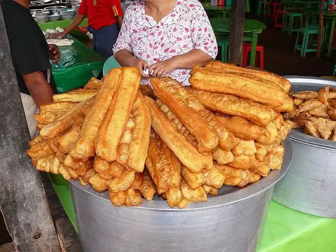 油条是中华民族喜爱的日常食品。随着中华民族的迁移也被带到了海外,并且溶入了当地民族的生活之中。它在老家的原名是‹炸秦桧›后叫‹油炸桧›。缅甸友人称之谓‹伊加贵›。这背后的千年汉奸卖国贼的历史他们可未必了解。中华民族子子孙孙是永不会忘的。