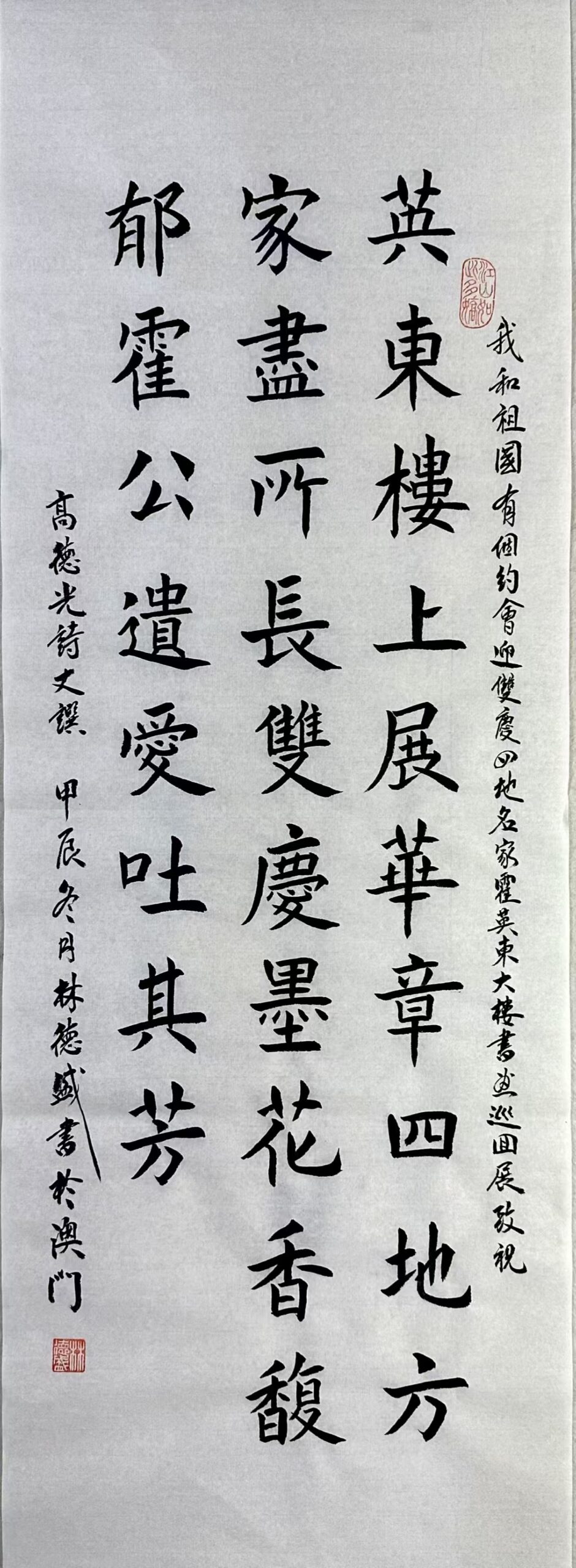 . . 華夏文明今古傳, 楚辭漢賦宋唐篇。 濠江薈萃吟風雅, 葡韻悠揚入管絃。 融滙中西相碰撞, 切磋音律共承宣。 好將世界詩歌節, 砥礪騷壇笑比肩。 书法 一〉馮利發 二〉劉北照 三〉茂松 四〉黎勝培 五〉周永騰 六〉吳錦蓮...