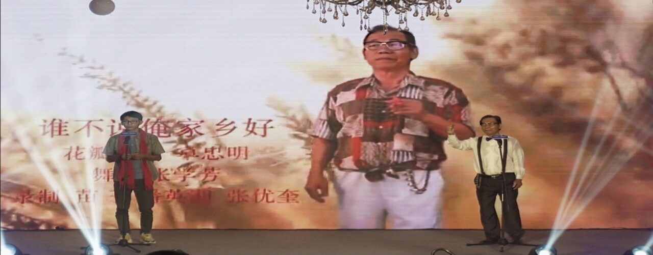 卓叶与徒弟卓琳皓(左)以世界首创的红花~绿叶对歌形式,向大会和爱心们献上《谁不说俺家乡好》,引来了热情的满堂喝彩声。