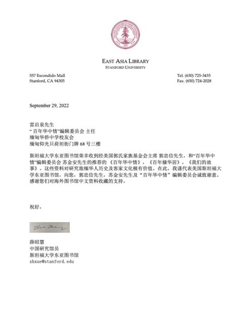 作为研究海外华人华侨的重要史料,斯坦福大学东亚图书馆正式收藏了 “百年华中情“ 等书!下面是斯坦福大学给 “百年华中情” 编辑委员会发过来的感谢信!