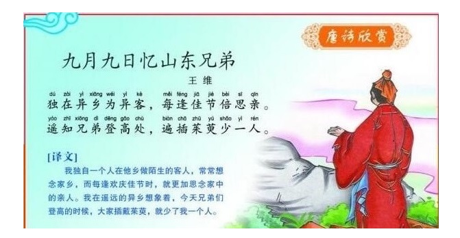 此诗原注:“时年十七。”说明这是王维十七时的作品。王维当时独自一人漂泊在洛阳与长安之间,他是蒲州(今山西永济)人,蒲州在华山东面,所以称故乡的兄弟为山东兄弟。九月九日是重阳节,中国有些地方有登高的习俗。《太平御览》卷三十二引《风土记》云:“俗于此日,以茱萸气烈成熟,尚此日,折萸房以插头,言辟热气而御初寒。” [2] [3] [4]