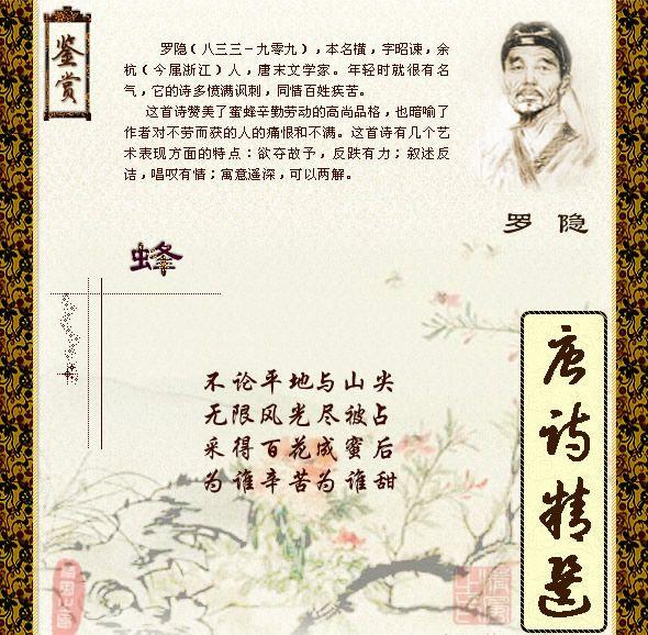 《蜂》是晚唐诗人罗隐创作的一首咏物诗,也是一首寓理诗。这首诗赞美了蜜蜂辛勤劳动的高尚品格,也暗喻了作者对不劳而获的人的痛恨和不满。这首诗艺术表现方面的特点为:欲夺故予,反跌有力;叙述反诘,唱叹有情;寓意遥深,可以两解。