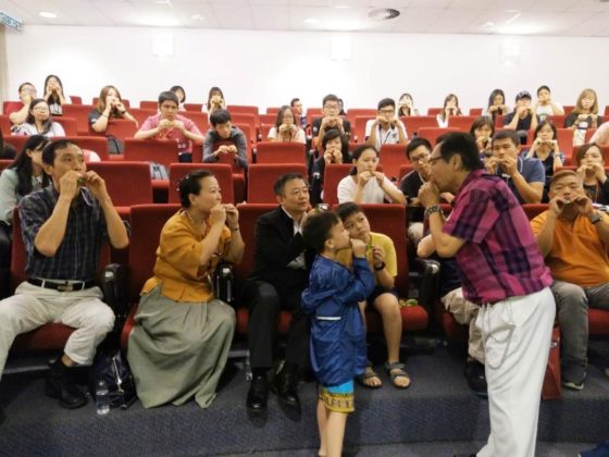 我用树叶和金叶吹奏了”北风吹”、”我爱马来西亚”、”康定情歌”、”莫斯科郊外的晚上”、”美丽的西班牙女郎”、”喀秋莎”。为了丰富吹奏感染力,我加上了单吐、滑音、颤音,以及二部三部轮吹等技法。整个会场自始至终掌声不停,笑声阵阵,激情不断。在黄院长等人的带领下,全场人人手持一叶,呼呼连吹,约40分钟内,便有6人吹响了树叶。除黄院长之外,还有印度籍学生,及年仅8岁的孩子。他们是拉曼大学首先吹响树叶的先驱者,大伙敬称他(她)们是”拉曼未来之声“。每当一个人吹响一声,全场就响起雷鸣般的掌声 !