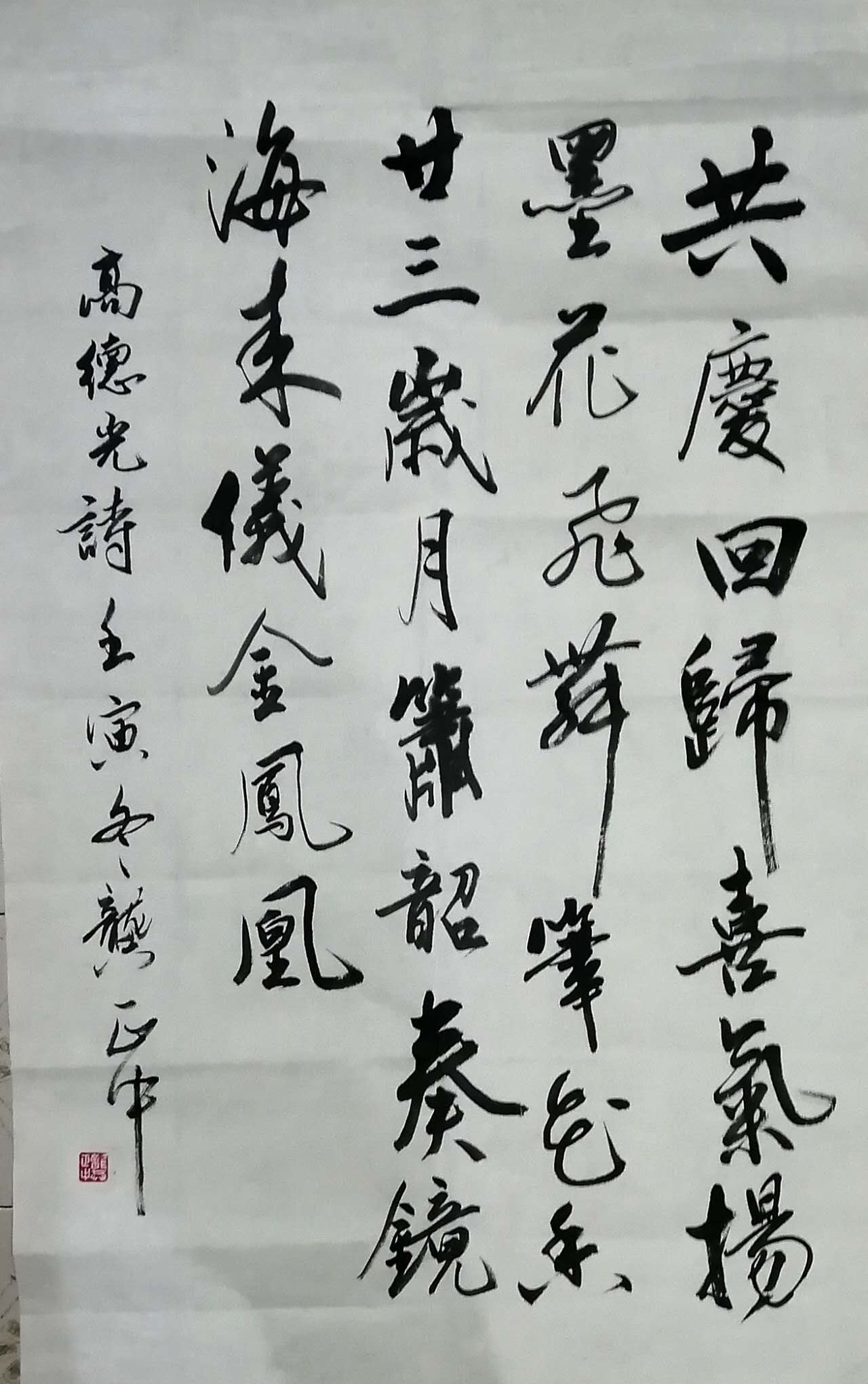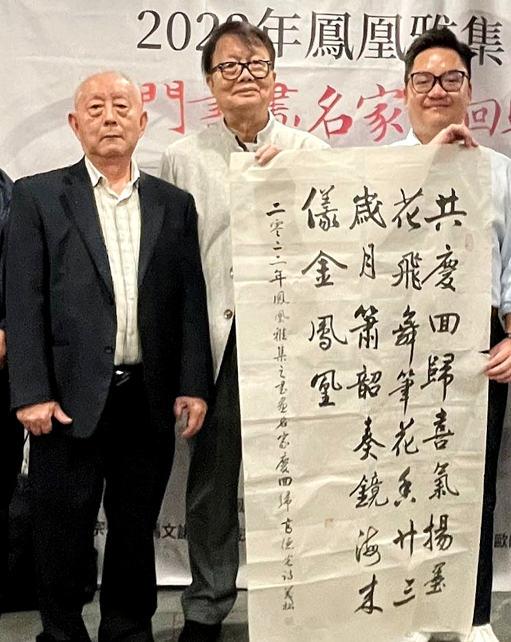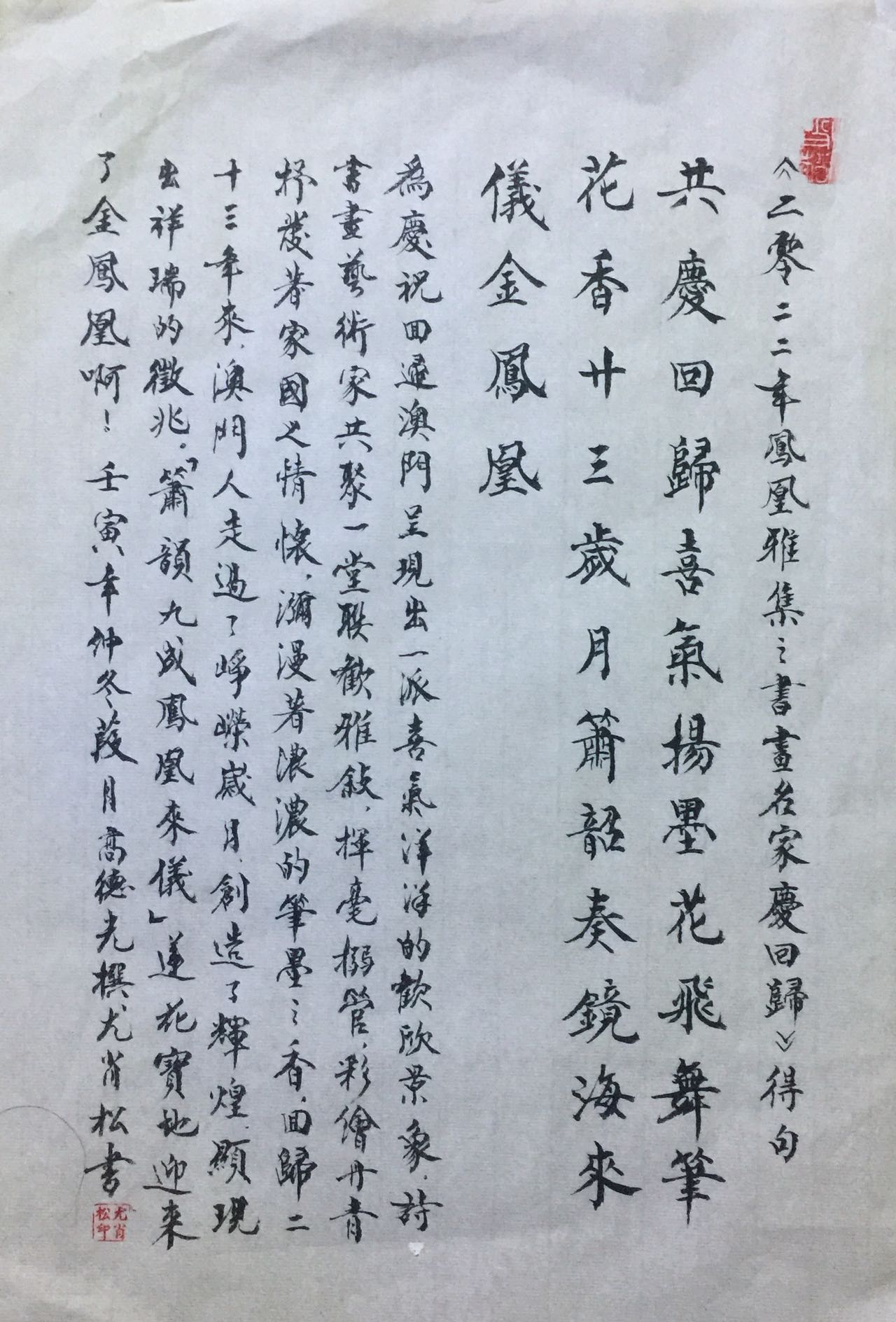 為慶祝回歸,澳門呈現出一派喜氣洋洋的歡欣景象。詩書畫藝術家共聚一堂聯歡雅敘,揮毫搦管,彩繪丹青,抒發著家國之情懷,瀰漫著濃濃的筆墨之香。回歸廿三年來,澳門人走過了崢嶸歲月,創造了輝煌,顯現出祥瑞的徵兆。“簫韶九成,鳳凰來儀,蓮花寶地迎來了金鳳凰啊。