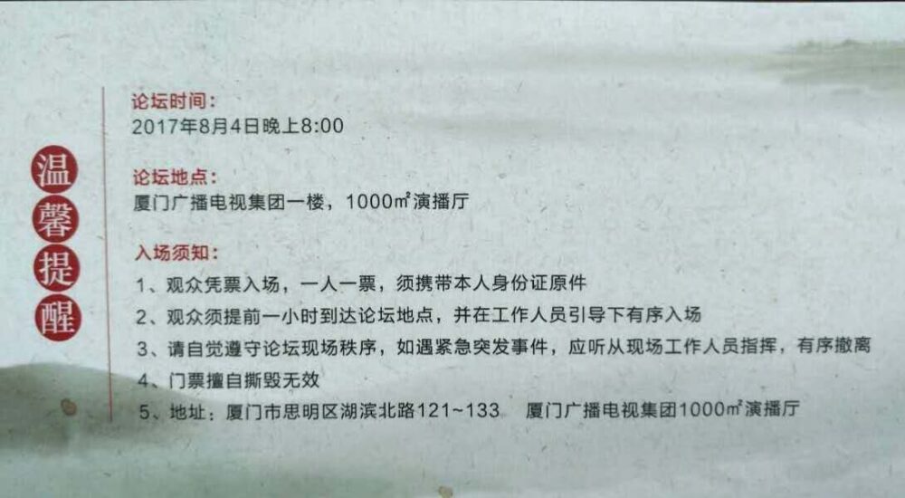 2017年8月4日晚上8:00,我应邀参加了厦门广播电视集团1000平米演播厅喜迎金砖《华侨旗帜 民族光辉》论坛录制现场,聆听受采访者绘声绘色的讲述,彰显了陈嘉庚先生爱我中华一颗赤城之心,他“卖大厦养厦大”之举,令人感动不已。为此,我特赋八声甘州词一阙点赞。