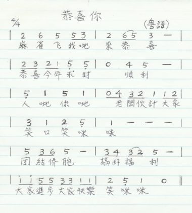 收到周天保寄來的新年祝福,同时傳來一首賀年歌。他說:春節將临,想起朱徐佳老師教過的一首用粵語唱的贺年歌,那是60年代初的春節,由中山學校組成的樂隊向臘戍僑胞們拜年時唱的,當時是由周荣悦叔带领,徐順浩伯摄影,江彬,陈丽菲等同學聞歌起舞,留在臘戍過年的外地老師們也一起同樂……。