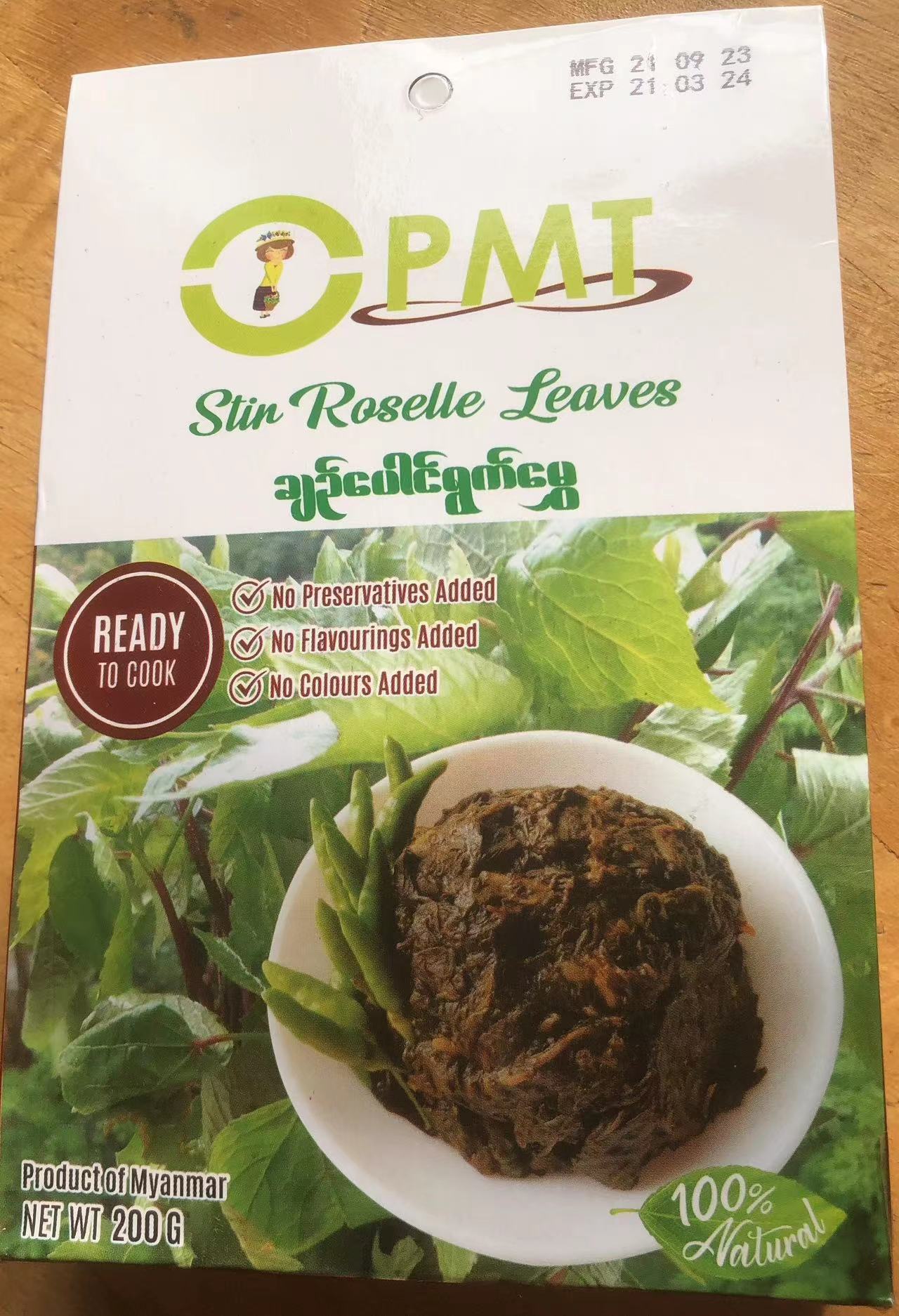 侄儿从仰光来香港旅游,送我一袋洛神花色拉(见图一),英文Slin Roselle Leaves ,缅文ချဉ်6ပါင်ရွက်,又名“七毛一“。