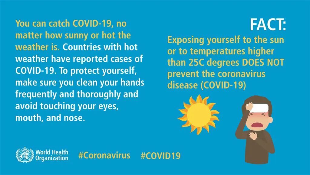 无论阳光多充足,或天气多热,您都可能会染上新冠病毒。天气炎热国家也报告了COVID-19病例。为了保护自己,请务必经常认真洗手,而且不要触摸眼睛、嘴巴和鼻子。
