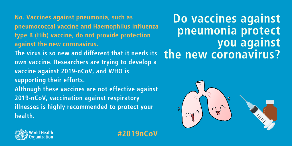 这一病毒是新的病毒,需要有专门疫苗。在世卫组织支持下,研究人员正在努力开发新型冠状病毒疫苗。这些呼吸道疾病疫苗对预防新型冠状病毒虽无效果,但我们强烈建议接种这些疫苗,以维护健康。