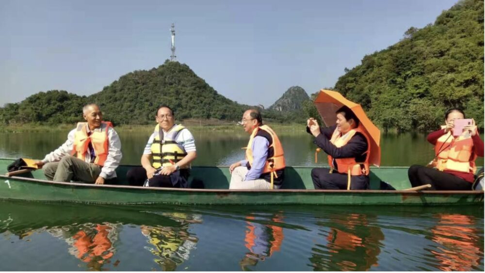 我们用木浆划破清澈如镜的湖水,穿梭在 “普者黑”自然山水形成的水墨画中, 让人仿佛在仙境里游荡。山水共长天一色,奇山碧水,山清水秀,群山环绕,渔 舟轻泛。古镇廊桥,洞穴秘境,湖中仙山一样的小岛,是真正的世外桃源,这里远离现代世界的喧嚣和粉尘,“普者黑”是一个让人感到心灵震撼的地方……
