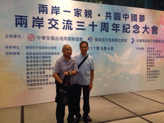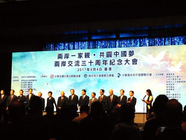 9月4日由中华全国台湾同胞联谊会、两岸和平発展联合总会和中华两岸和平発展联合会(台湾) 联合举办的「两岸一家亲,共园中国梦,两岸交流三十周年纪念大会」,在香港会展中心举行。大会的组织包括:主办单位、承办机构、恊办单位等9个团体,以及支持媒体11家。参加的嘉宾约计千人左右。汇集了两岸四地,关心两岸关系发展,促进合作,为实现祖国统一事业的有志之士,真是高朋满座。