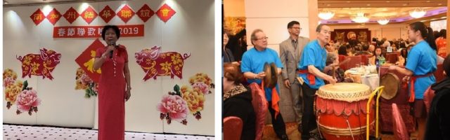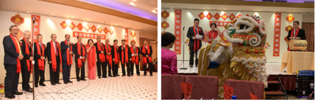 左:全体董事及名誉会长向来宾们拜年及献唱贺年歌,右:瑞狮呈祥