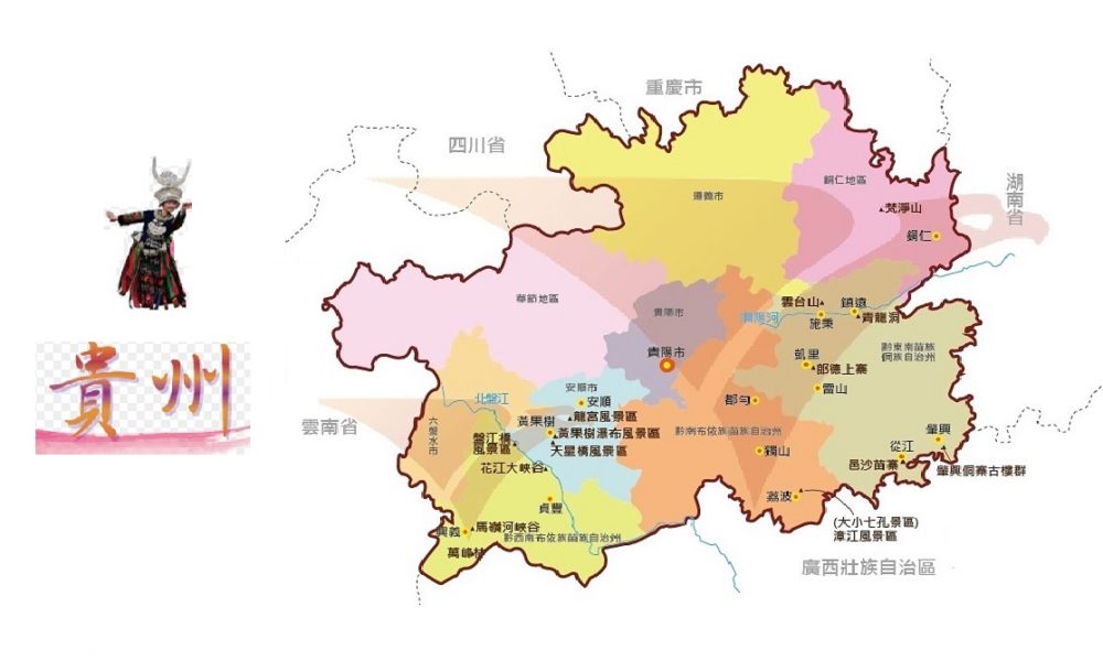 中国的地图像只公鸡,贵州就在鸡腿附近,其实贵州是—处不发达落后的地区,自然地理条件有90%是山地,交通非常的不方便,不久前有“想致富,先开路” 的说辞,所以贵州全省开展修路建桥热潮。基本上和发达的城市争取连结。建火车快车道,飞机场,在这五年内贵州己经成为快速发展的地区而闻名遐迩。贵州的名字看汉字上面是中,中间是—,下边是贝,上中代表中华,中国。下方的贝代表宝贝,珠宝,因此贵州是中国的一个宝贝。600多年前中国有学问有知识学者们就预言贵州有一天将成为国家珍贵的区域。