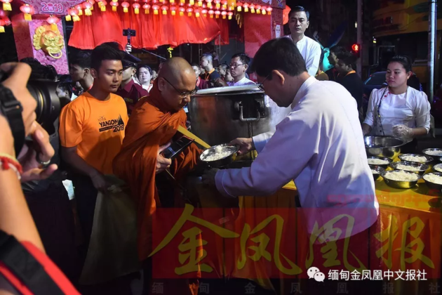 当日清晨五时,庆典的首项活动是向1500名高僧布施,仰光华人与缅族胞波们自发地早早来到现场,依缅法佛理布施高僧大德,供奉斋食、物品等,人们共同祈福国泰民安,胞波友谊地久天长。