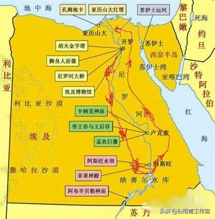 下面的图,是埃及旅游的标准行程,大多数都差不多。想去埃及玩的,可以收藏这一张地图。一般大家都从开罗出发,顺尼罗河逆流往上,到阿斯旺大坝。再顺尼罗河,回头,顺流到亚历山大港。沿途玩诸多景点。