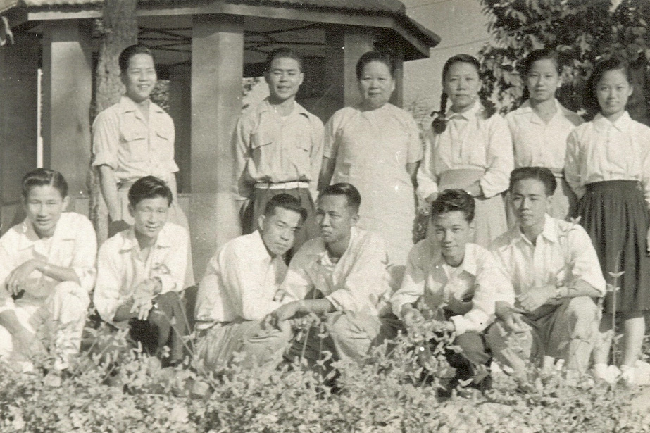 在华中的凉亭前,后排左三是李国华校长,前排右二是邱国壤