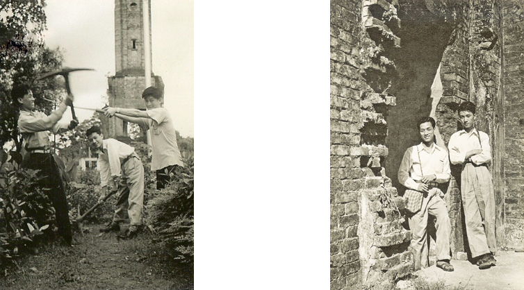 邱国壤(中)在残破的钟楼前劳动,邱国壤(右)在残破的钟楼下