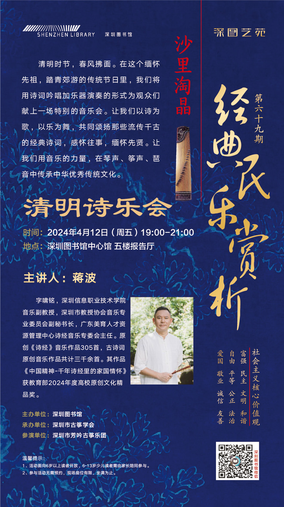 我在微信里看到了“经典民乐赏析-清明音乐会”的宣传单,主讲人蒋波是深圳信息职业技术学院音乐副教授,深圳市教授协会音乐专业委员副秘书长,广东美育人才资源管理中心诗经音乐专委会主任。他原创诗经音乐作品305首,古诗词原创音乐作品三千余首,其作品《中国精神-千年诗经里的家国情怀》荣获中国教育部2024年度高校原创文化精品奖。