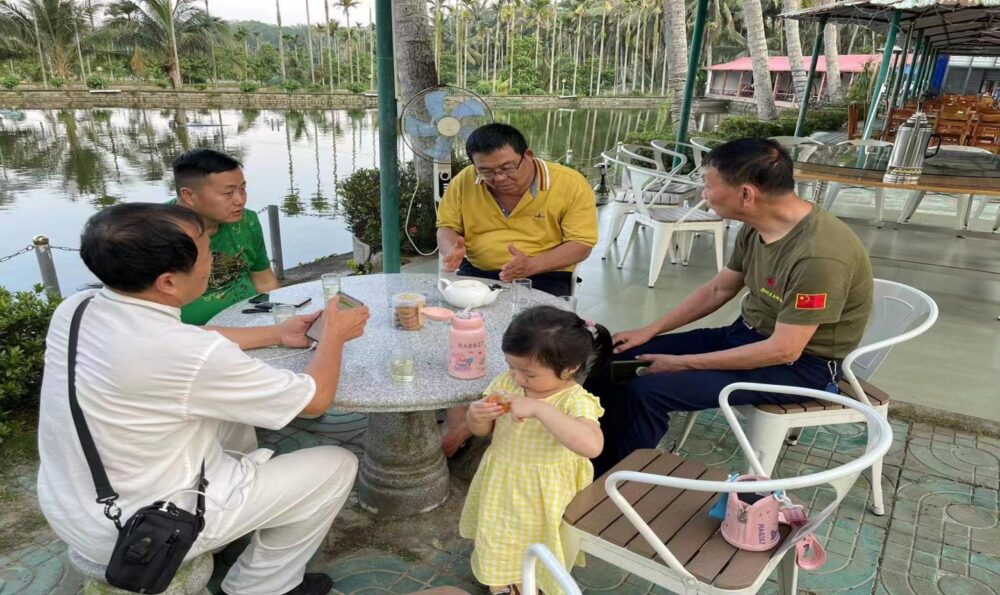 周建林老少三人在“莲姐山庄”细心听取兴隆华侨农场侨办负责人黄日平先生(中)的介绍