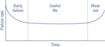 bathtub curve 浴缸曲线。上图 所示的浴缸曲线代表了许多产品中的故障模式。纵轴是每个时间点的故障率,横轴是测试时间(或产品上市后的时间)。浴缸曲线分为三个区域:早期失效、使用寿命和磨损