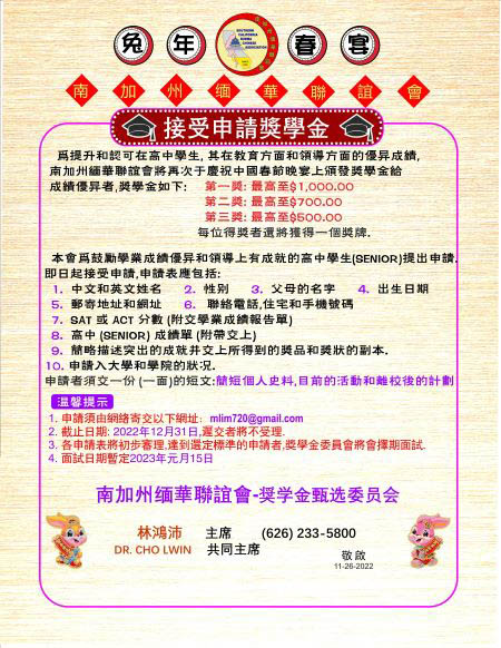 转载请注明:《南加州缅华联谊会《春宴》《申请奖学金》通知》 复制链接