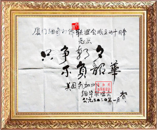 转载请注明:《厦门缅甸归侨联谊会成立四十周年志庆 美国南加州缅华联谊会 贺》 复制链接