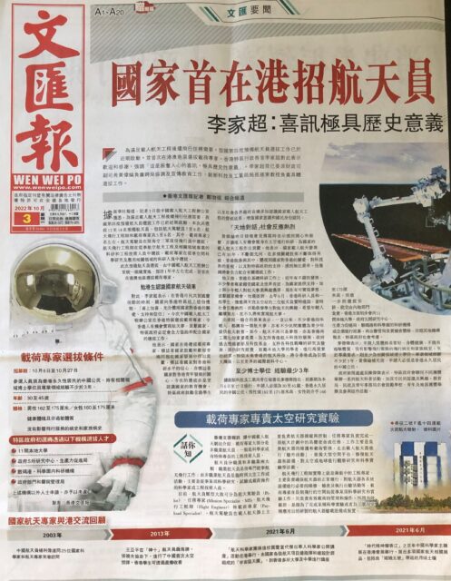 香港特区行政长官李家超在庆祝国庆73周年的大会宣布了这个振奋人心的喜讯:国家首在港招航天员。他说,喜讯极具历史意义。