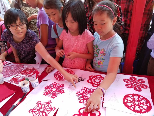 原来各华校的老师们正在表演剪纸,书法、绘画、茶艺、中国结等技艺,并身教言传,来宾们和小朋友们亲身感受到中华文化的魅力!老师们虽然辛苦了一天,但她们的心里却是美滋滋的,因为她们是中华文化的传播人,也是中缅友谊的使者!