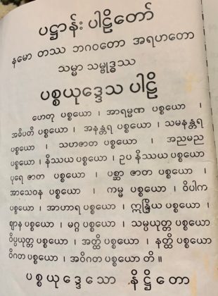 我八岁时母亲带我到和尚庙拜请主寺长老赐教,我有幸从初级课本(丁崩机)读起,不久老和尚开始教我梵文(巴利文),字里行间字母重重叠叠,初时难读,久而久之,也就习惯了,只是其意不易理解。我的缅甸话讲得音准流利,加上得到良师教授深文,因此缅文基础较好。