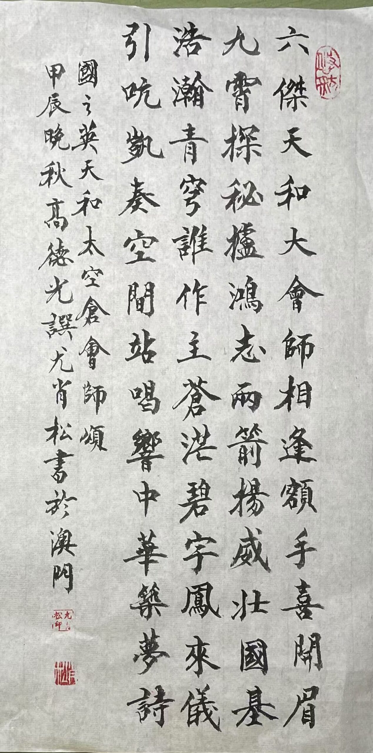 . . 華夏文明今古傳, 楚辭漢賦宋唐篇。 濠江薈萃吟風雅, 葡韻悠揚入管絃。 融滙中西相碰撞, 切磋音律共承宣。 好將世界詩歌節, 砥礪騷壇笑比肩。 书法 一〉馮利發 二〉劉北照 三〉茂松 四〉黎勝培 五〉周永騰 六〉吳錦蓮...