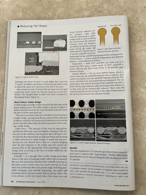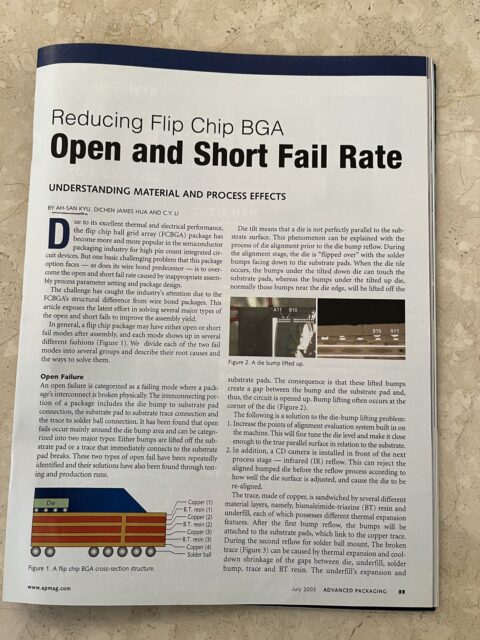 上圖是我和兩位工程師(來自海峽兩岸)共同發表的技術文章。內容涵蓋,靜態記憶晶片的植球封裝元件產生的電路中斷和電路短線的分析和改良設計。