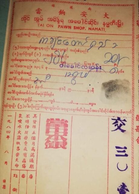 2022年的當票,全部用緬文了,因為緬甸社會都用緬文,人民不懂華文,而且不放華文在當票內,不會產生緬甸民族的反感。大家和睦相處。(灣莫當舖鍾寶霞掌櫃(總經理) 提供。)