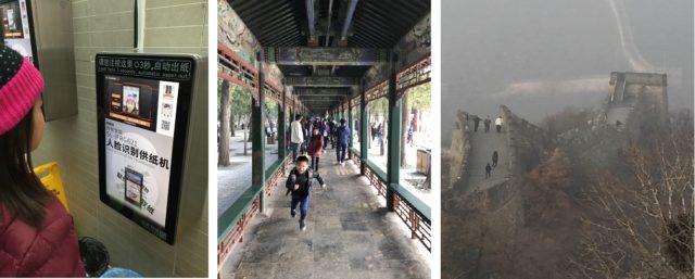 左:鸟巢卫生间的人脸识别供纸机,中:颐和园的长廊,右:向慕田峪长城的至高点冲去