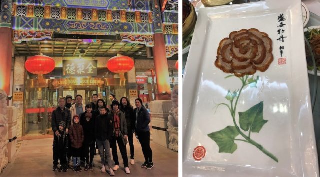 左:全聚德王府井总店,右:烤鸭肉排成花朵上桌