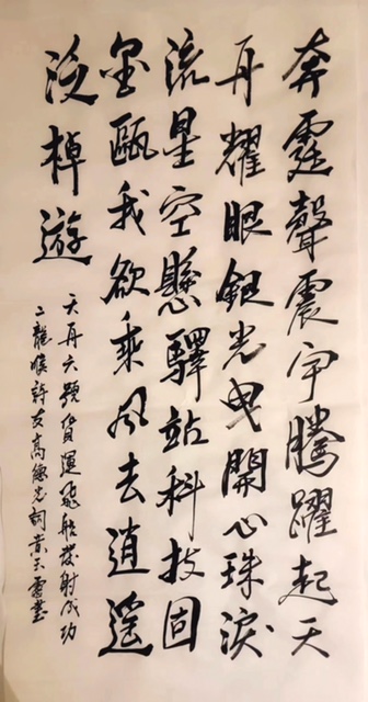 . . . . 一道銀光耀太空, 神舟怒吼刺蒼穹。 爭鋒碧漢超群志, 問鼎瑤天絕代功。 星海揚帆雲作浪, 宇航探秘氣如虹。 他年買棹遊仙境, 築夢重霄唱大風。 . 书法 一〉劉澤蒲 二〉茂松 三〉周永騰...