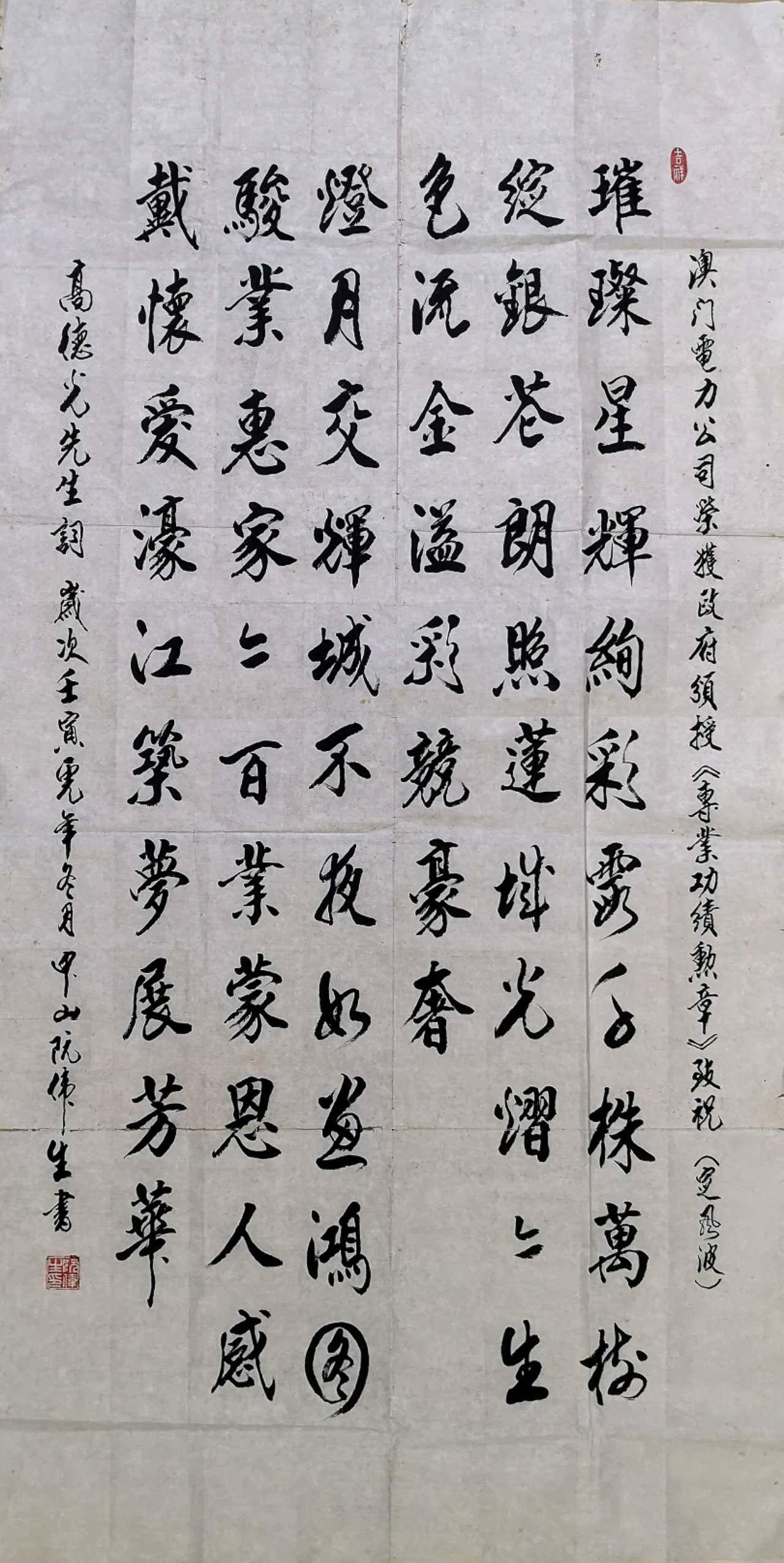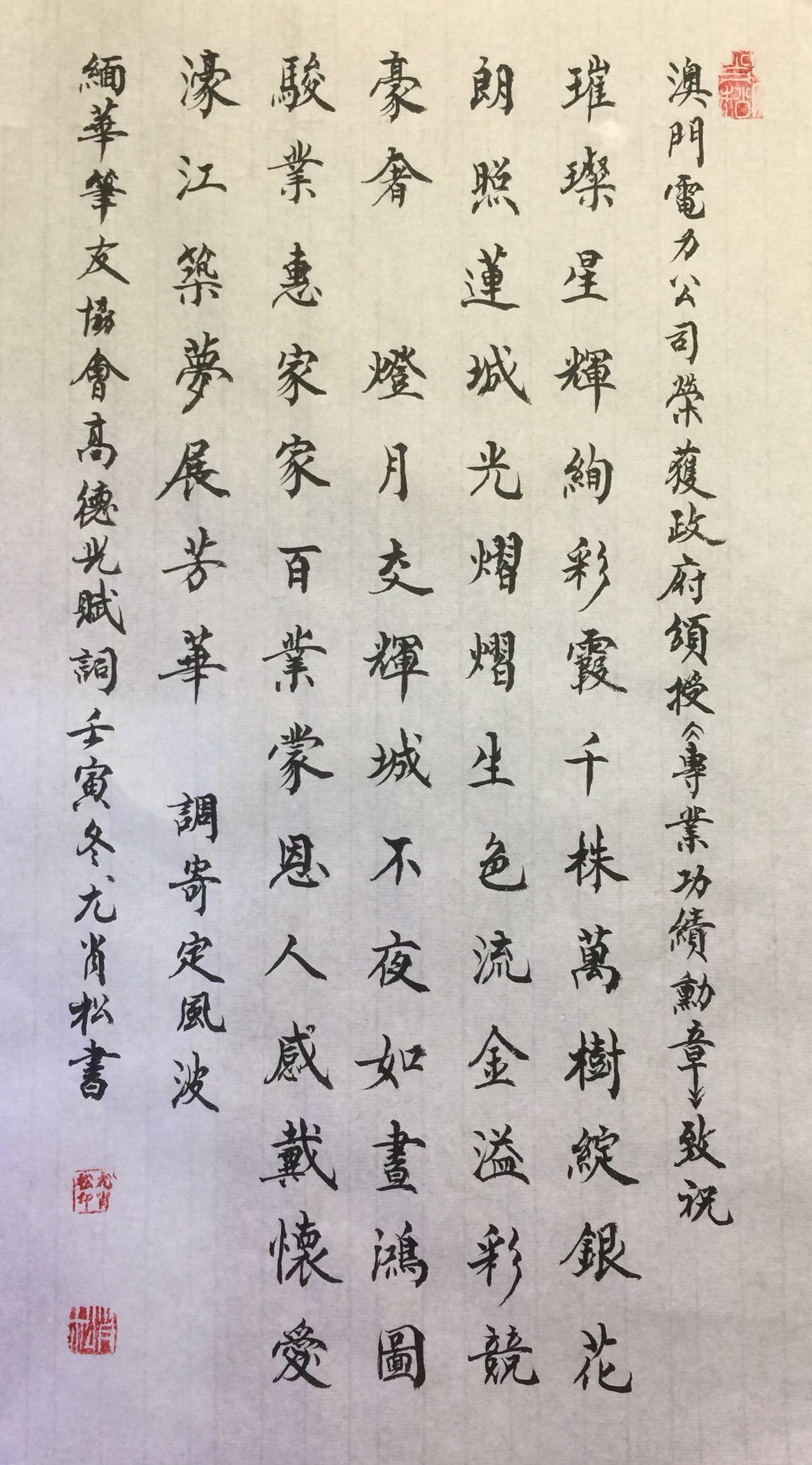 转载请注明:《定風波……澳門電力公司榮獲政府頒授《專業功績勳章》致祝(文/德光,书法/阮毓明,尤肖松,阮偉生,茂松,吳建華,周永騰,黃偉華)》 复制链接