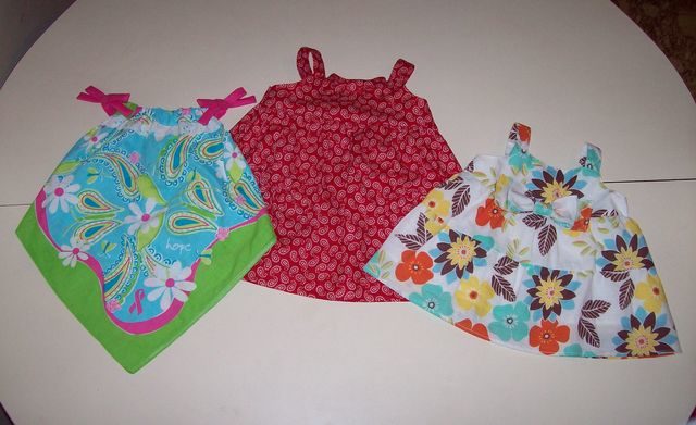 只見:一件大紅小白細點燈籠袖小洋裝配上白色圓領、一件大花兩層荷葉短裙配以蝴蝶結、一件黃色檸檬花樣無袖荷葉邊洋裝、一件上身白色下身三色補丁花的小衣裙配以兩色蝴蝶結、一件…… 其中一件是以一條漂亮紅綠花色的手巾做成的背心装,那是依照手巾邊沿的特色剪裁成菱形的下擺,配以桃紅色肩上蝴蝶結,漂亮又別緻。對著這些小不點的成品,越看越可愛,不盡有點王小二賣瓜,自賣自誇起來。