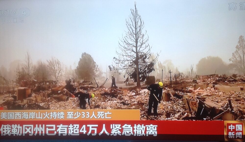 中国大部分土地在温带,东西南北均有山林,东北有著名的兴安嶺大森林,这几年也有山林大火报道。由于政府重视火灾,消防巡视周到,群众防火意识较强,能够有效控制火场,扑灭烈火。由于不像美国林中建有千万住宅,没听说有生命财产损失。