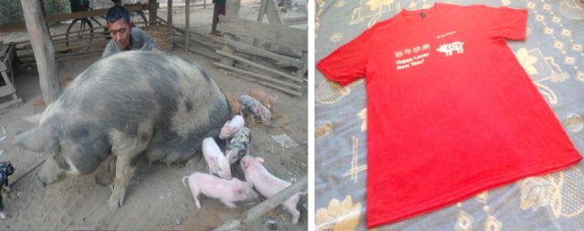 笔者参加了许多游戏,丢包转盘,得了不少礼品。比较新鲜的是,好多游戏,参与者要用手机微信照二维码,过去未曾见过。有一个转盘处,笔者眼见年轻的女工作人员,身着红色T恤,上有可爱的小花猪,猪年吉祥,十分想买,探问何处出售,姑娘见状心受感动,从桌下抽出一件,悄悄送我。我惊喜不已。