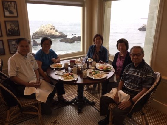 参加华英校友会周年晚宴当天的早上,曾国瑛邀请我们(粟福祥,陈先施夫妇和我)到太平洋海边的(Cliff House)西餐厅吃早餐,面对着辽阔无边的海洋,品味着新鲜可口的西式面包,螃蟹,番茄,蘑菇,鸡蛋包和各种水果。自然地回忆起在缅甸时的无忧无虑,快乐的大学生活,真使人无比陶醉。