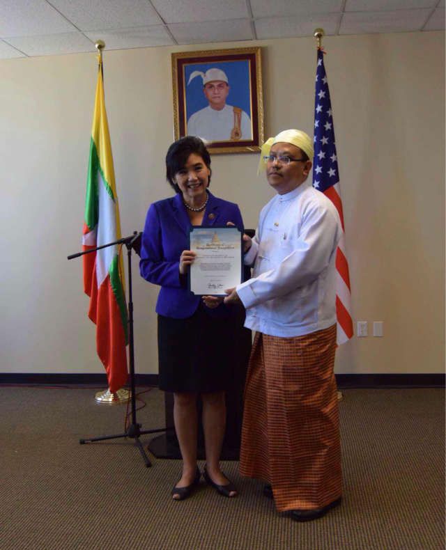图四 缅甸驻洛杉矶首任总领事宇昂皎山接受荣誉证书