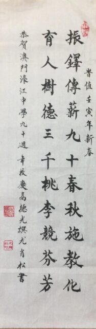 转载请注明:《恭賀澳門濠江中學九十週年校慶(文/高德光, 书法/尤肖松)》 复制链接