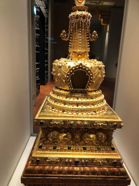 寶塔(內務府造辦處)清乾隆十一年(1746年)金、半寶石、珍珠—故宮博物院。這是清宮首座大型金佛塔,由乾隆帝下令鑄造、佇立在重華宮佛堂內,供日常修佛用。乾隆帝將先父雍正帝的潛邸雍正府改建成全國最具規模之藏佛中心,更接受國師章嘉活佛(1717-1786)灌頂,潛心修佛,是歷代帝王中鑽研藏佛教最深者。