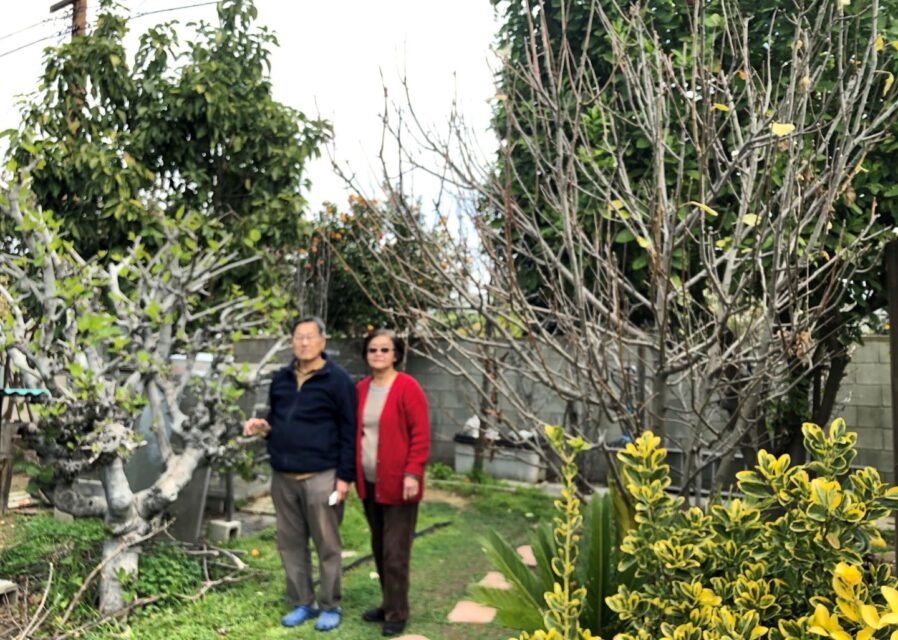 2006年,我们的兩个儿子,在洛杉矶阿汉布拉市,集资购买公寓楼,有四个单元,我们由橙县搬来,发现前后均有空地,前面种草,后面荒置。经其他三家同意,我利用闲暇时间,清理了后院狭小荒地。该地由新土堆积,碎石片瓦到处分布深埋,栽种植物,虽然施肥却长不好,没办法,我只好一个坑一个坑将碎石土挖空一尺多深,填入肥料土,脱胎换骨之后,种树效果好了一些。