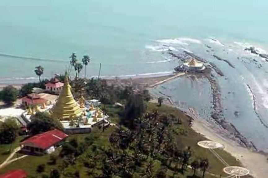 他倆從摩定佛塔下來,脫了鞋,拿在手上,赤腳走向海灘不遠的一座海心塔,這是建在一塊巨礁上高十多米的白色佛塔,整座塔是一條盤坐的緬甸龍(緬甸龍與中國龍外形不同,緬甸龍沒腳。),龍頭在塔頂,此時正值退潮,可以徒步走到塔下,他倆在摩定塔上已買好貢品,虔誠地膜拜龍神。