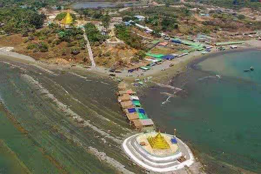 蛇山海灘,即無山也無蛇,當地居民不多,此時朝陽初昇,湛藍的天空飄著朵朵白雲,譚德才和阮惠瓊的前方,是一望無邊的大海,白色的海浪一浪接一浪沖向岸邊,整個海灘清潔到沒有一個塑膠袋、啤酒瓶、飲料瓶之類的人造垃圾。海邊一塊礁石上建有一座小塔,是唯一的建築物,回頭看背後,是一片密密麻麻的椰林,成千上萬株椰子樹,成為一堵天然的屏障。這地方沒有酒店,一年中只有十五天有緬甸旅客到這裡來,是一個沒有人造垃圾,沒有污染的海灘,尤如仙境般的風景區。