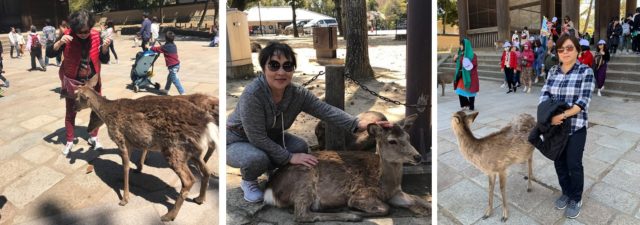 奈良公园内饲养着许多鹿,奈良人崇拜和喜欢鹿,公园里放养着1000多头鹿,这些鹿一点都不怕人,自由地生活,游客可以买一些饼干来喂养它们。这些鹿也会追着行人要东西吃,有时会咬住衣角,我们有位团友就被神鹿咬了一口,大腿留下了一个红红黑黑的咬痕。