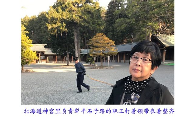 记得在北海道神宫的前院里见过一位职工衣装革履地在犁平石子路。日本的上班一族都穿西装,男学生也一律穿西装。导游说日本很注重小学生的身心发育,他们背的书包都是特别设计以保护腰背,在市场上的价格大约为50美元一个。