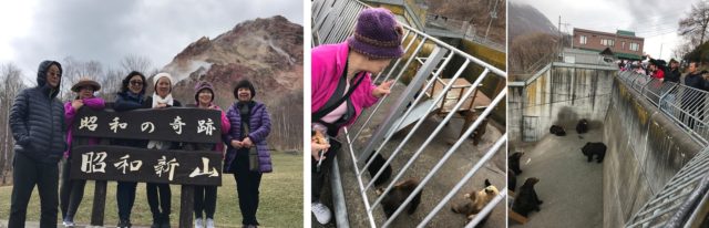 昭和新山,是北海道有珠郡洞爷湖附近的活火山之一,我们在山脚拍照,能看到山腰处还在冒着火山浓烟。昭和新山附近有个熊牧场,养着100来隻棕熊,参观站有小卖部,游客可买10日元一包的小饼干去喂熊。