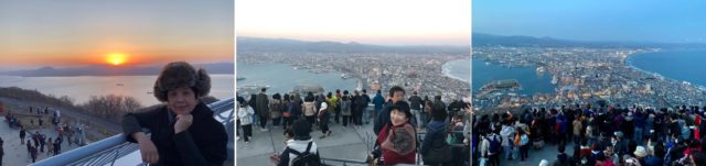 函馆夜景,函馆市位于北海道南部,函馆山是座小山丘,坐缆车上到山顶看日落及看函馆的夜景是来此一遊的首选,导游介绍函馆夜景是世界有名的三大夜景之一(中国香港;日本函馆及意大利那不勒斯)。上到山头,虽不是旅游旺季,遊客还是很多,人挤人,大家都争相占好有利位置观景和拍照。